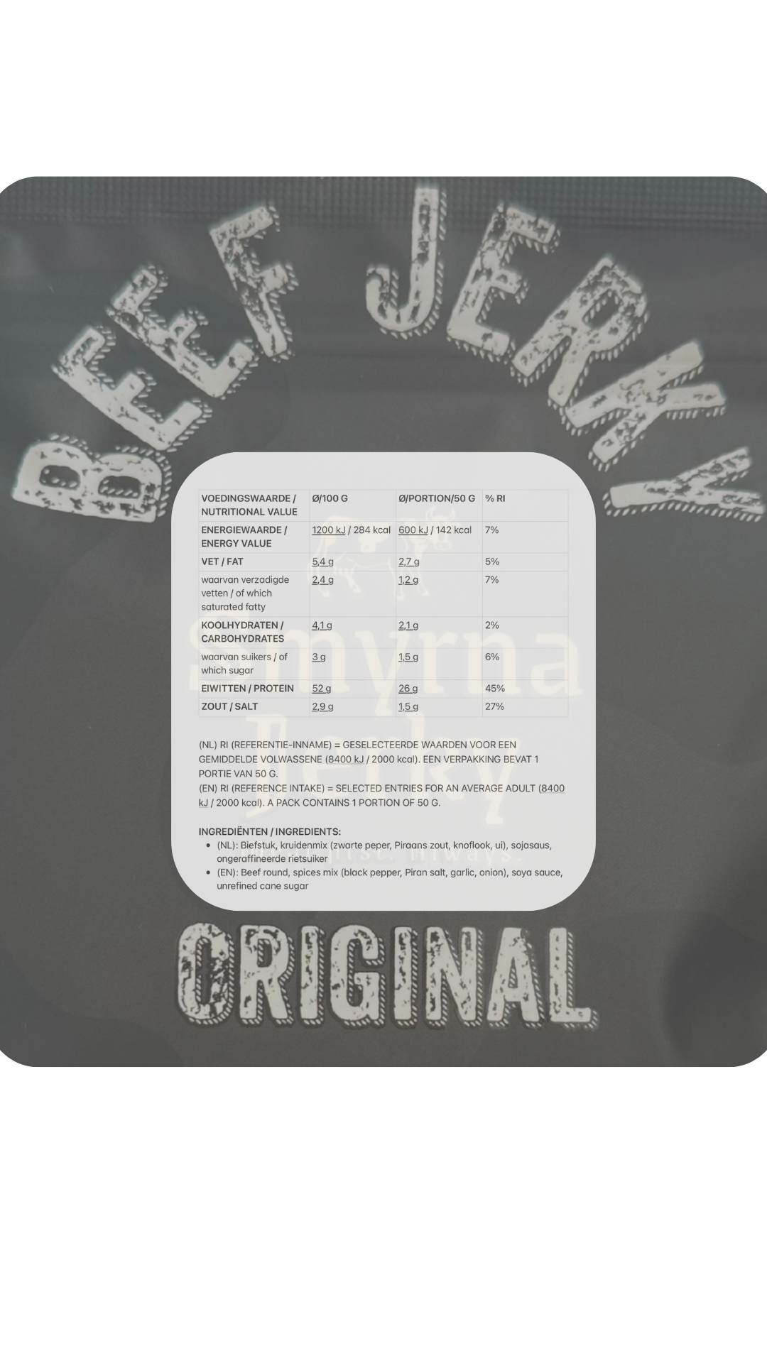 RI (Referentie-inname) = geselecteerde waarden voor een gemiddelde volwassene (8400 KJ/2000 KCAL). Een verpakking bevat 1 portie van 50 G.
